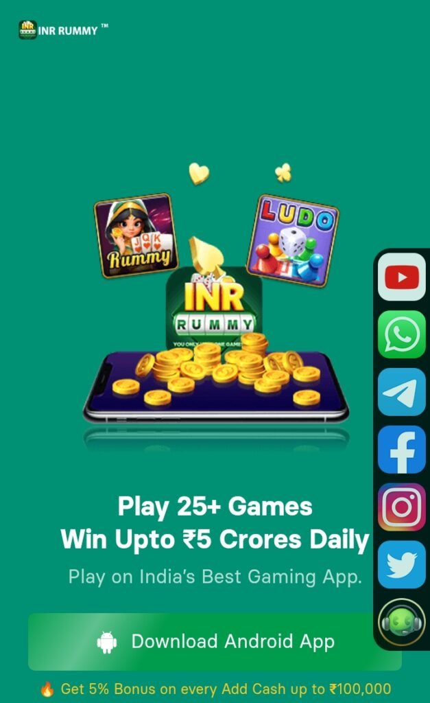 Hardly welcome to my dost, Inr Rummy app new app has been launched, you guys download it, the download link is given below, you can download from there and login your mobile number so that you can get the bonus Rs 250.